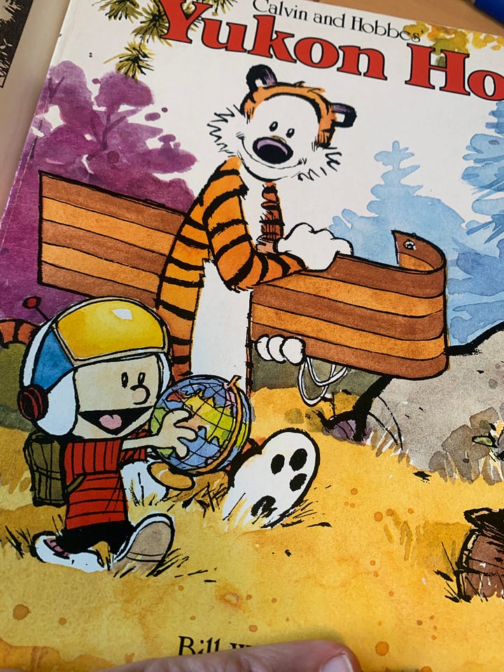 Und was finde ich da? Eine Kiste mit alten Comics. Und ganz oben auf dem Stapel lag ein „Calvin und Hobbes“-Band. Als ich ihn aufschlug, musste ich grinsen …